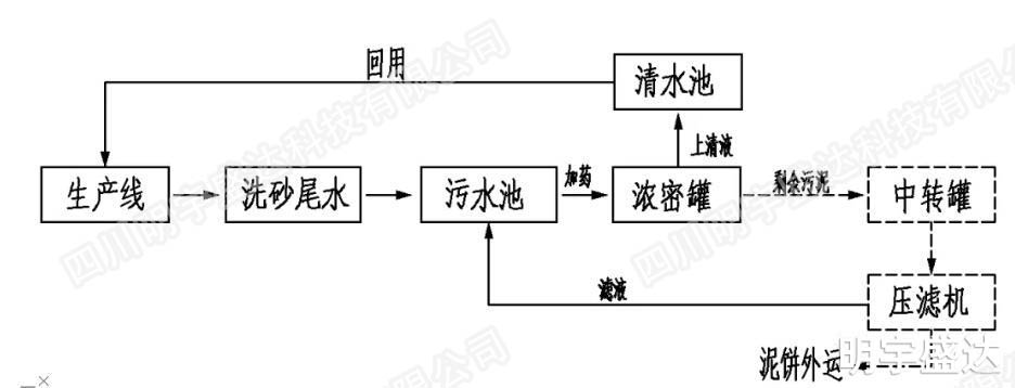 生產加工過程中需要進行洗砂操作以便從原料中分離出成品砂石,期間會產生洗砂尾水。洗砂尾水的主要污染物指標是懸浮物,懸浮物大量存在形成泥渣水,從而導致水體污染,無法循環使用。根據要求,需要對生產廢水進行處理,達到環保要求。項目考慮將處理后的廢水進行回用。